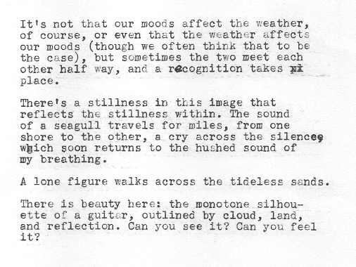 Very lovely image, and the noiseless words fit well. I just realized that your “m” is missing its right foot, exactly like the “m” on my Noiseless Seven! LikeLike Reply