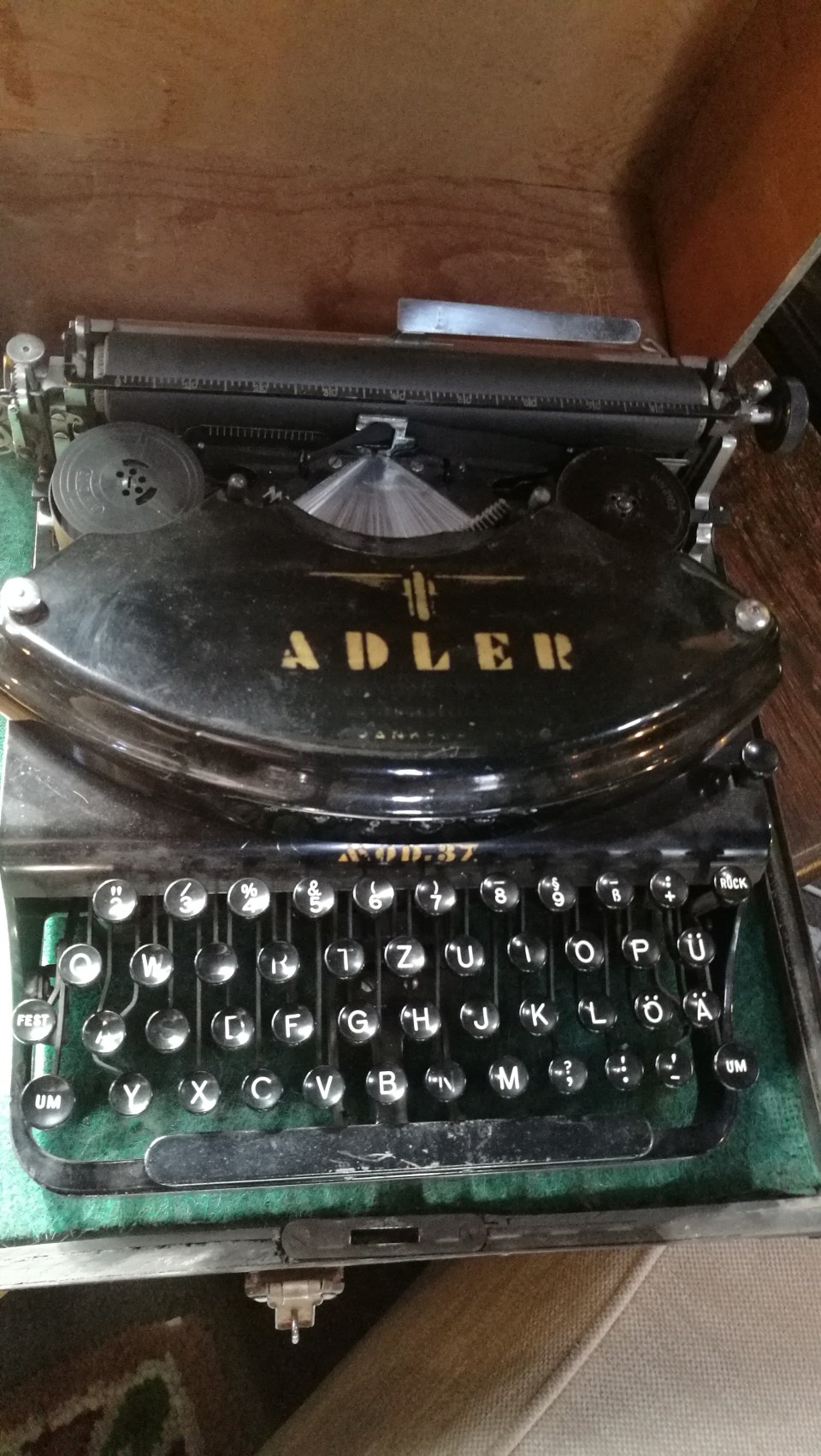 Adler Mod.37. The model 37 was first created in 1937, but I don’t know if this machine was made then or soon after. Note the “thrust action” key-strike movement.