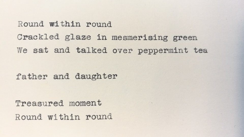 Another tentative step towards creative writing, which the typewriter seems intent on pushing me towards. When seeing this, my daughter said, “I suppose I’m the smaller circle, you the bigger?”. I replied, “I’m not so sure anymore.”
