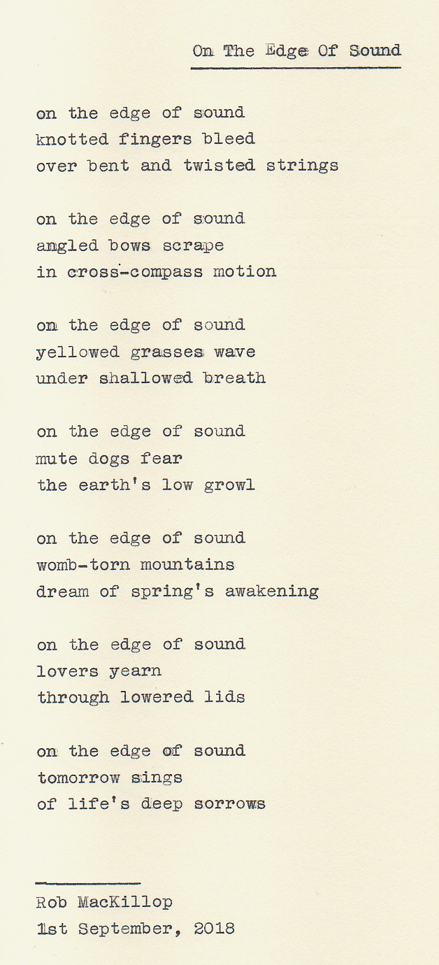 This poem starts out as a meditation on the moment of silence just before a sound is heard, like before the first note of a recital, perhaps. It then goes on to nature and the awareness of sound, before returning to the human experience, and concern for the future.