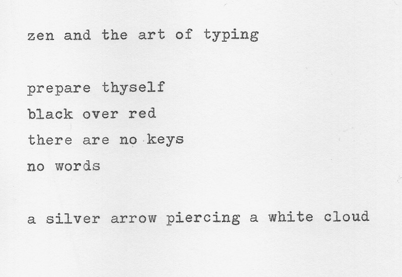 This poem appeared tentatively in blog post #5, but gets star billing here with slight but significant changes, and a new name. The colours refer to the ink ribbon, while the last line (in case it is unclear) refers to the type head (or slug in the US – why slug?!) hitting the white page, and also a thought emerging into consciousness.