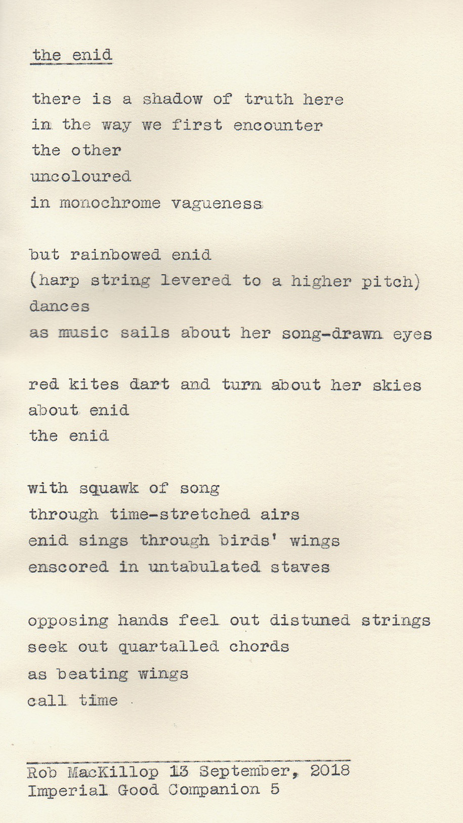 Enid is a harpist, presently studying compositional techniques. Her background is in traditional music, which tends to have a constant rhythm and restricted melodic and harmonic palette. Enid is keen to develop her musicianship into new areas, so we have discussed varying time values (“time-stretched”) and chords built on more open-sounding fourths (“quartalled”) instead of the usual thirds.