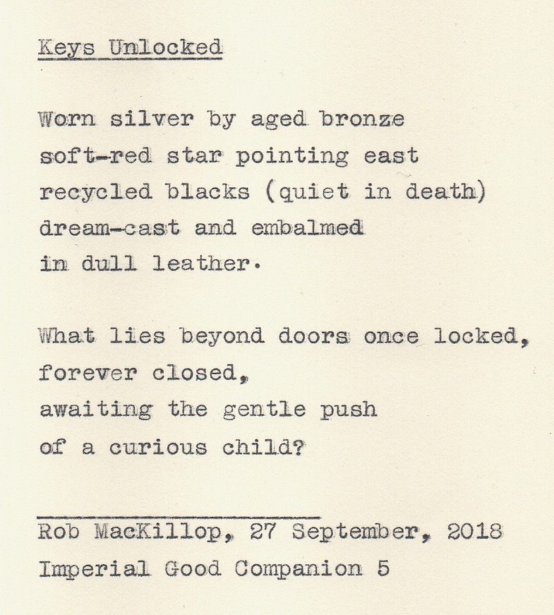 We spent over an hour talking about keys…house keys, and anything we associate with the word. Fair enough, it’s a good subject. The tutor said very little, so we listened to each other. Then we had fifteen minutes to write down our masterpiece, either as a short story or a poem. I think I might have been the only one who chose the poetry route. And here it is. An explanation follows, just in case you want or need one.